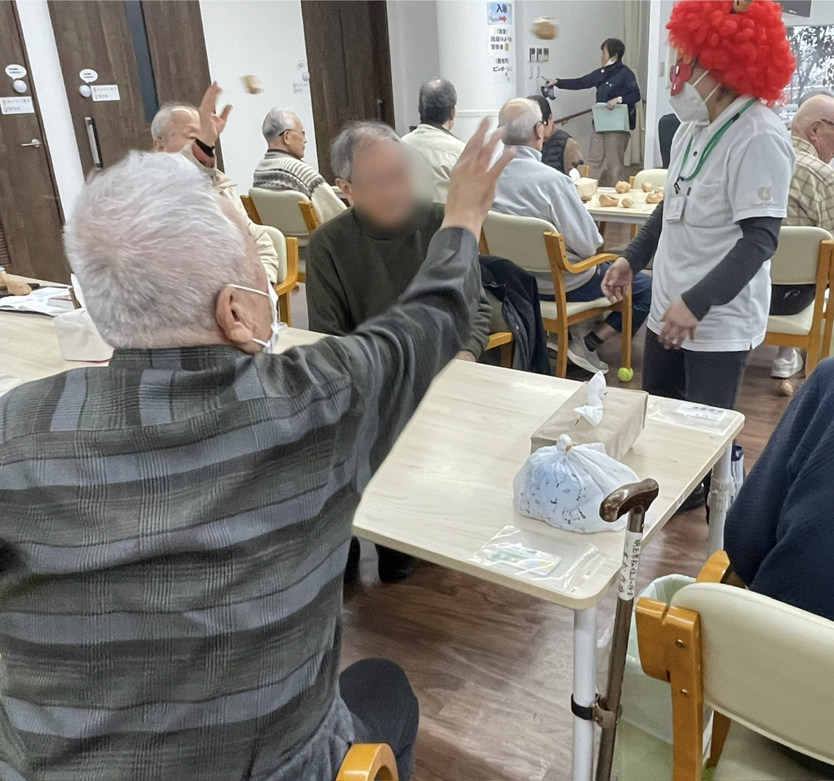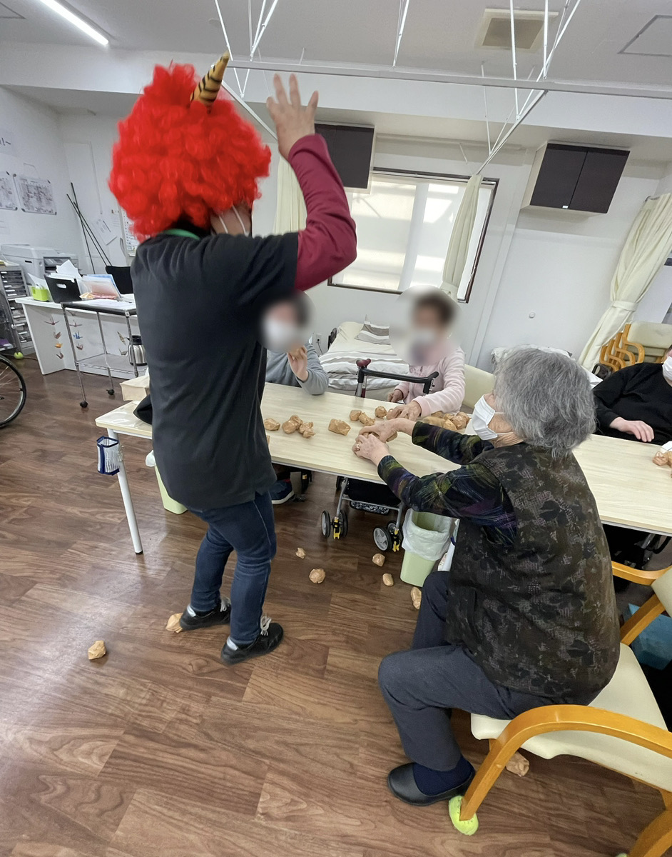 職員が扮する「赤鬼」👹が登場! 利用者様には、病気や災害などの悪いものを追い払うように、力いっぱい豆を撒いていただきました。