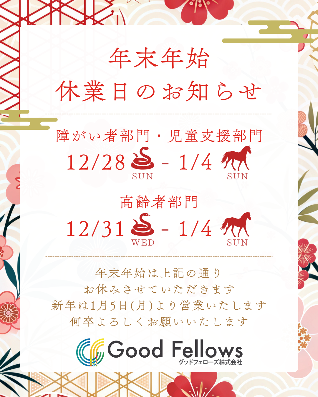 グッドフェローズ株式会社より、年末年始の休業期間についてのお知らせです。